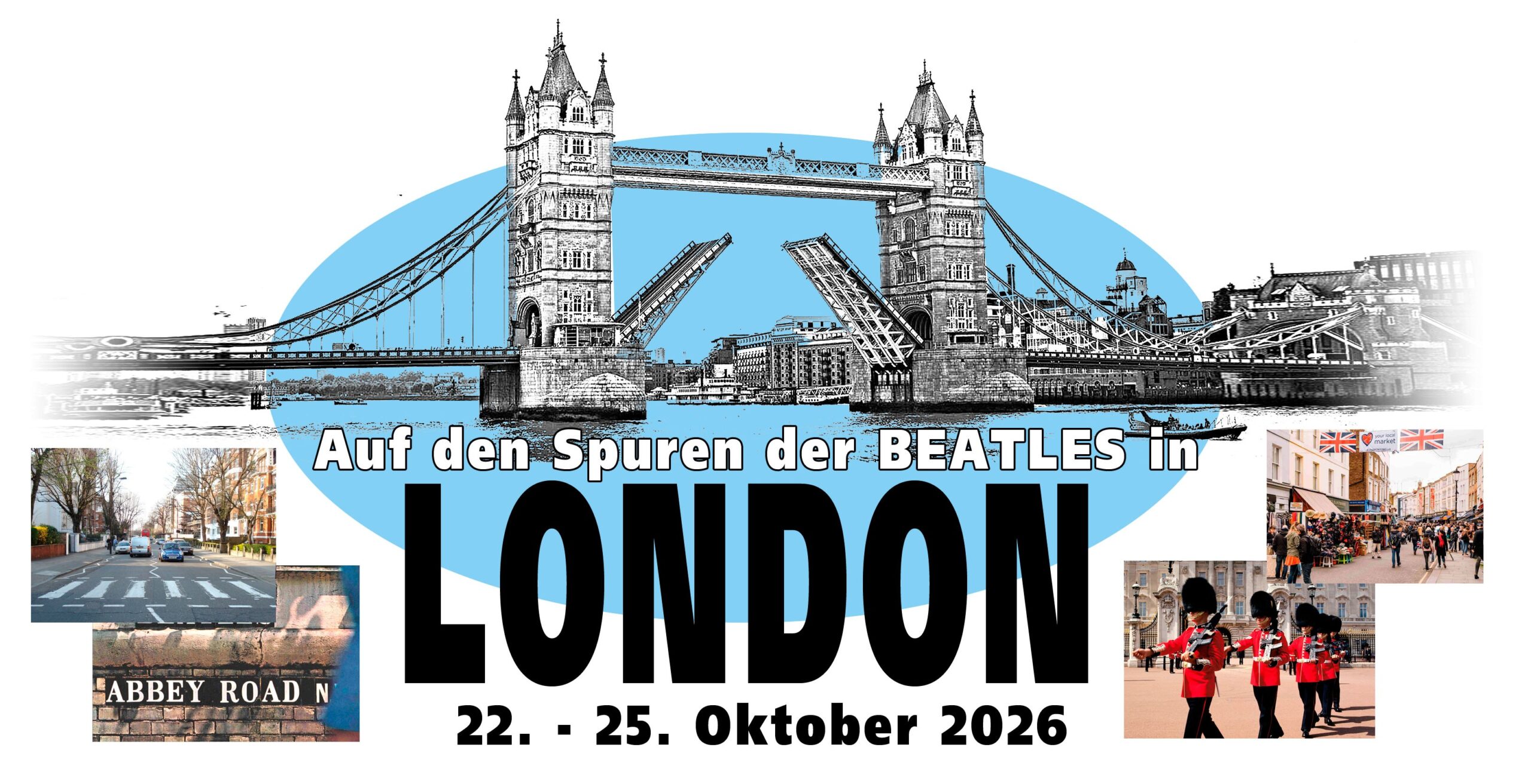 London spielte eine entscheidende Rolle in der Geschichte der Beatles: Nach sieben erfolgreichen Reisen zur International Beatleweek in Liverpool mit Les Sauterelles und Flaming Pie führt uns die bewährte Beatles-Reise-Idee nun dorthin, wo die Band ab 1964 ihr kreatives Zentrum fand: London. Viele Teilnehmende kennen Liverpool bereits bestens – die Begeisterung für eine gemeinsame Beatles-Reise ist jedoch ungebrochen. Abbey-Road Studios, Savile Row, Tittenhurst Park, Apple Records sowie Drehorte aus Help! und A Hard Day’s Night erzählen von einer einzigartigen Zeit der Musikgeschichte. Genau diesen Spuren folgen wir.